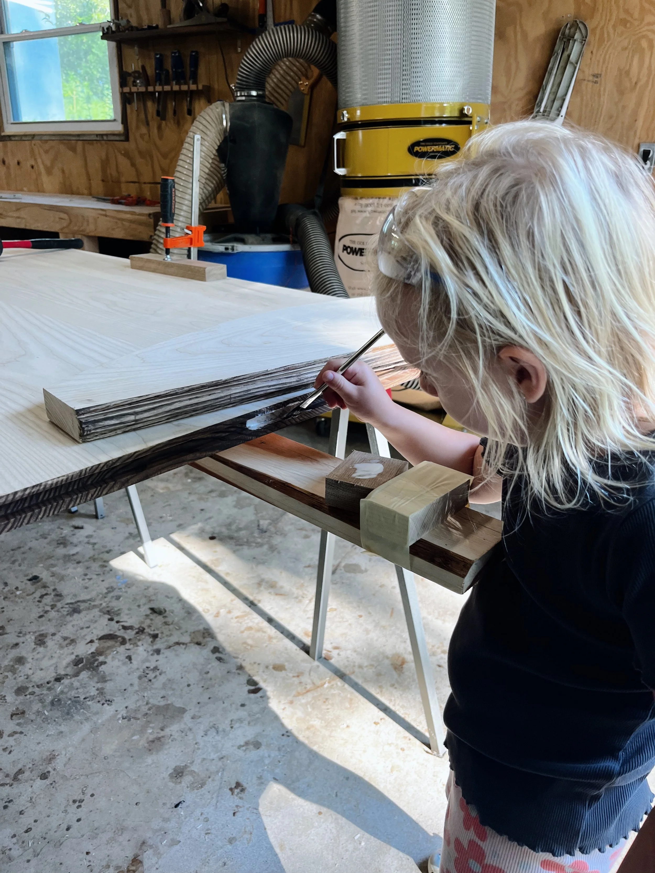 We are a family of woodworkers out of Durham, NC. Dustin began woodworking in 2016 when we looking for sustainable hardwood furniture that would be our style and last for generations. After a career change Gabi joined Dustin working on building the business to have a specific design voice. She now works alongside Dustin to create custom pieces. Hazel, our 5 year old is learning our craft alongside us and is very familiar with wood species and the workshop.